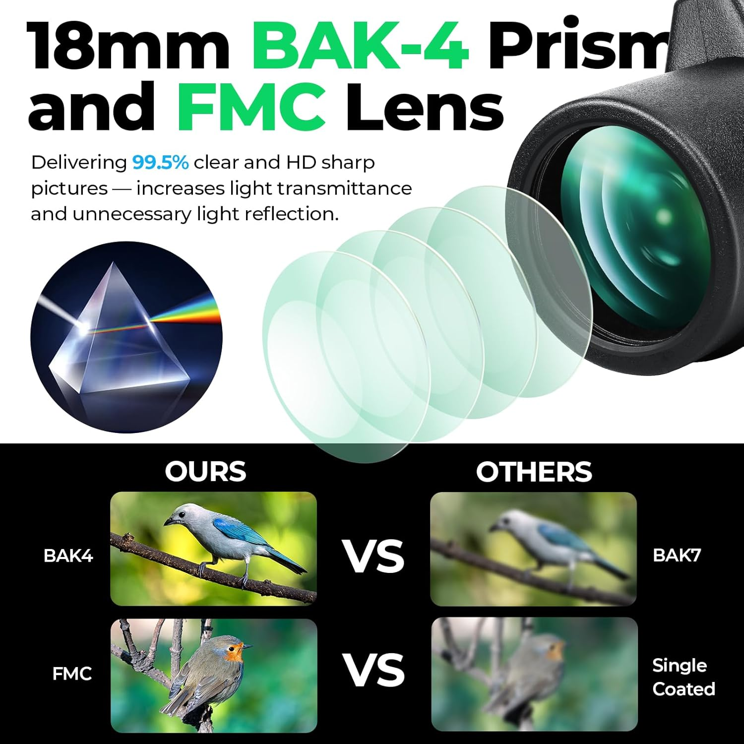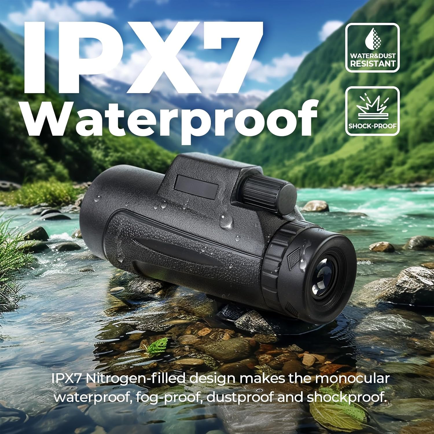 The wide angle monocular telescope is featured with high power 12x50 magnification which is the ideal magnification for distance watching. Plus, with a large field of view (352ft/1,000yds) and 6.5° wide field of view, the handheld monocular delivers a great viewing experience for outdoor activities such as bird watching, wild hiking or traveling. The HD monocular telescope boasts 18mm large BAK-4 optics prism and premium FMC (Fully Multi-Coating) lens, increasing the light transmission and high refractive index, minimizing the scattering, which ensures clear, bright, sharp images for you. Thanks to IPX7 Nitrogen-filled design, the adult handheld telescope is waterproof, fog-proof, dustproof, and shockproof, allowing it to be used in rainy weather and various environment. The lightweight monocular telescope is built to last, fully eco-friendly rubber armored providing a non-slip grip to the users, and comes with a portable hand strap for double protection. The twist-up eyecup can block the strong light and make it more comfortable for the eyes, which provides you with the ultimate comfortable watching experience outdoors. Plus, the eyecup is made of eco-friendly rubber material, not only comfortable but eco-friendly! The monocular also comes with the new high-quality smartphone holder that is compatible with all types of smartphones on the market. Easy to use and it is helpful when you would like to share with friends and family the close HD images without any shaking.