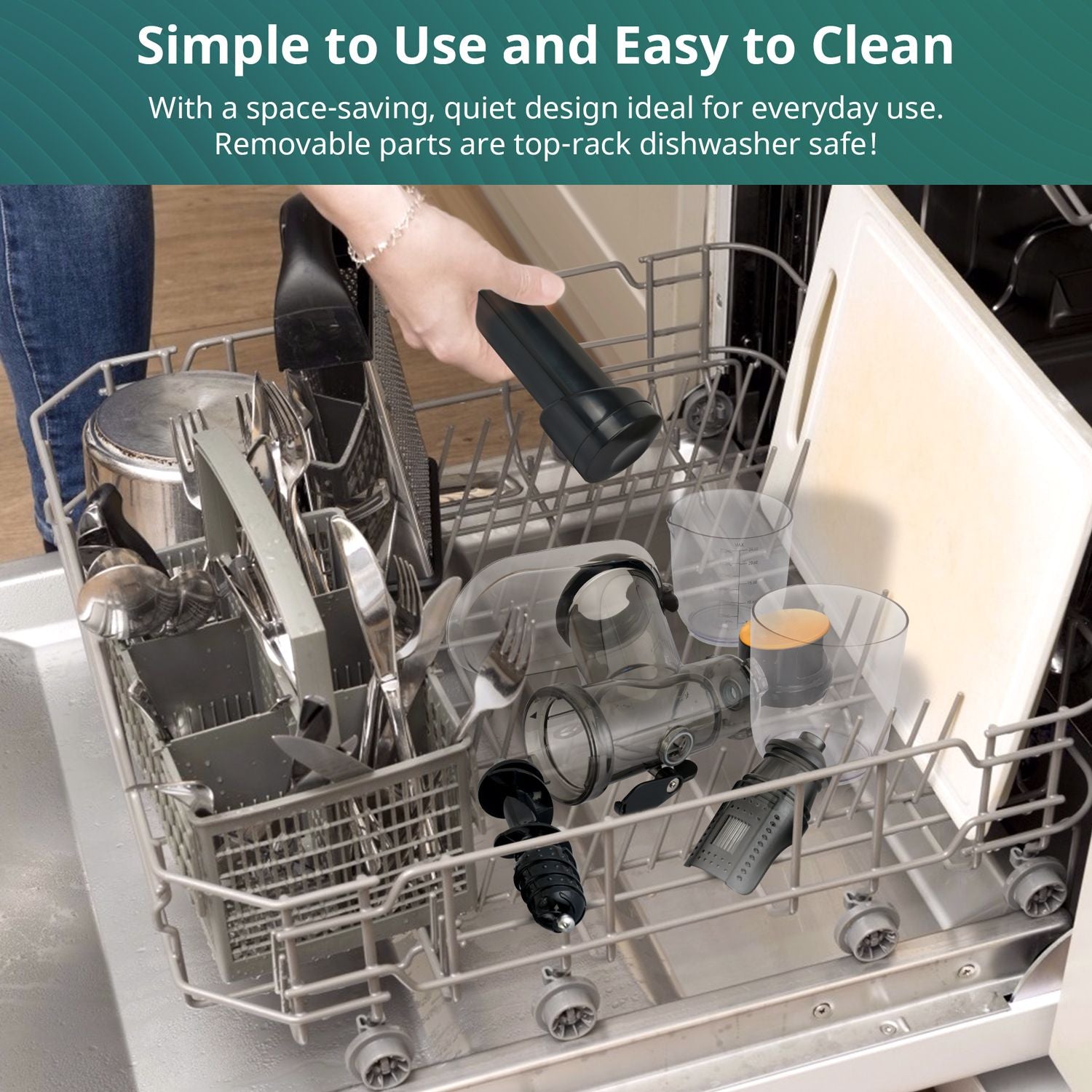 Masticating juicers like our cold press juicer machines use a gentle combination of high power and low speed of 90-110 RPM, exposing the foods to less oxygen which preserves enzyme and nutrient strength and yields higher nutritional value overall. The powerful squeezing action of the triple-stage auger extracts the maximum amount of nutrients, vitamins, taste, and juice from minimum amounts of celery, carrots, leafy greens, and other fruits, vegetables, or wheatgrass.The compact and sleek design of this slow juicer will not only save counter space but will also look great on your kitchen counter! The slow masticating juicer makes less noise when juicing compared to high-speed juicer machines and blenders. No more noise waking up the family early in the morning.